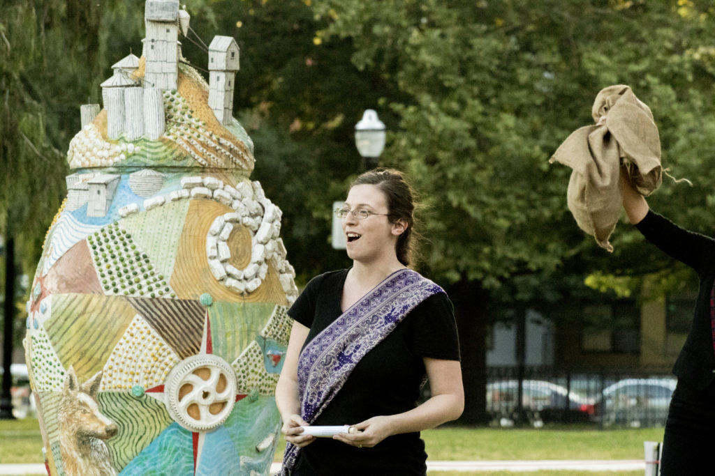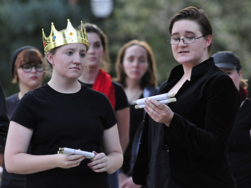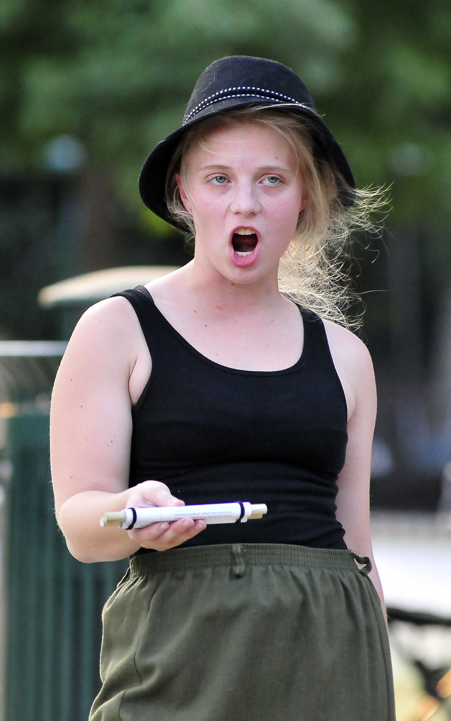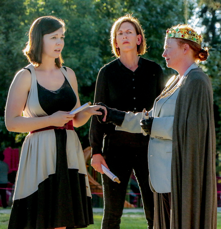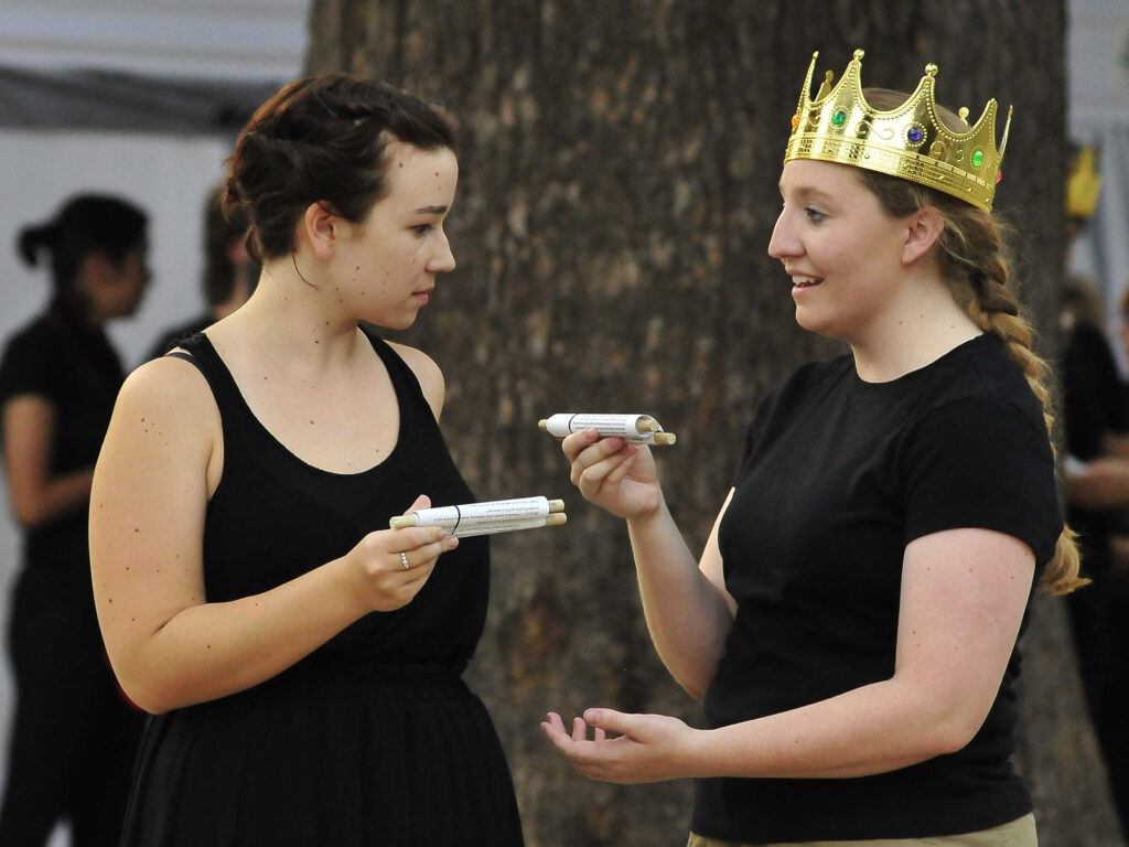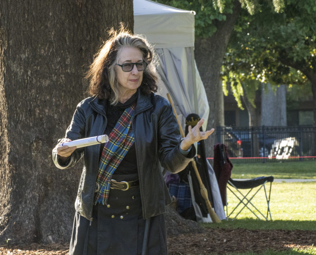 We’ve adapted this to be even simpler. We have limited rehearsals for two reasons: to follow the original practices concept, and to fit our plays in between plays at other theatres with limited time required. We also use a base costume with pieces added so actors can play more than one character without a full costume change. We perform outside, so we wanted to limit that. And we use limited music, and most sound effects are created live. Our actors carry scrolls with their sides only, and these scrolls can double as a variety of props. These scrolls also allow our actors to work quickly as they are not required to be fully memorized. And finally, we do like to end with a jig as they would have done, and as they do at Shakespeare’s Globe.